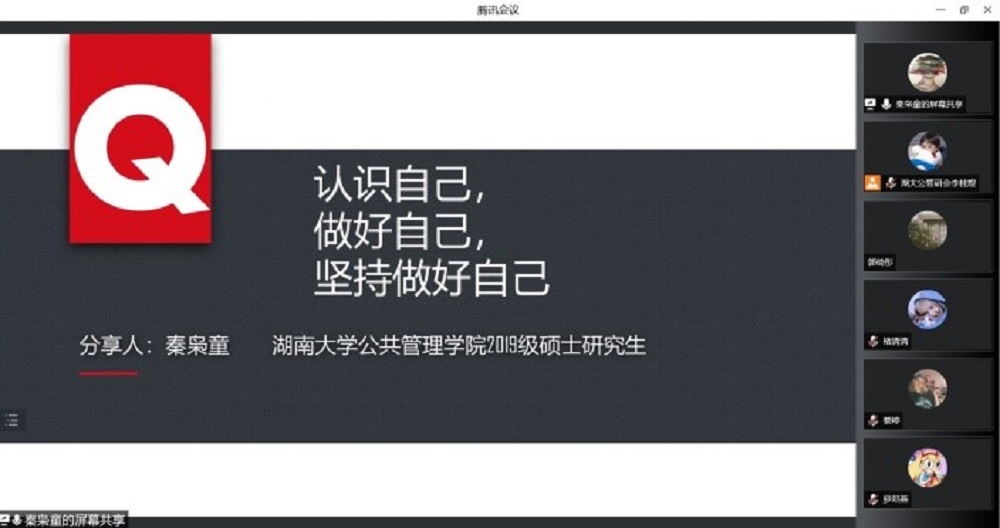 2022年5月26日下午,球友会以线上形式举办了庆祝千亿球友会公共管理学科恢复二十周年系列活动之“我的科研故事”分享会。荣获湖南省优秀毕业生、千亿球友会优秀研究生的2019级硕士研究生秦枭童以“认识自己,做好自己,坚持做好自己”为题进行了科研、升学经验分享。