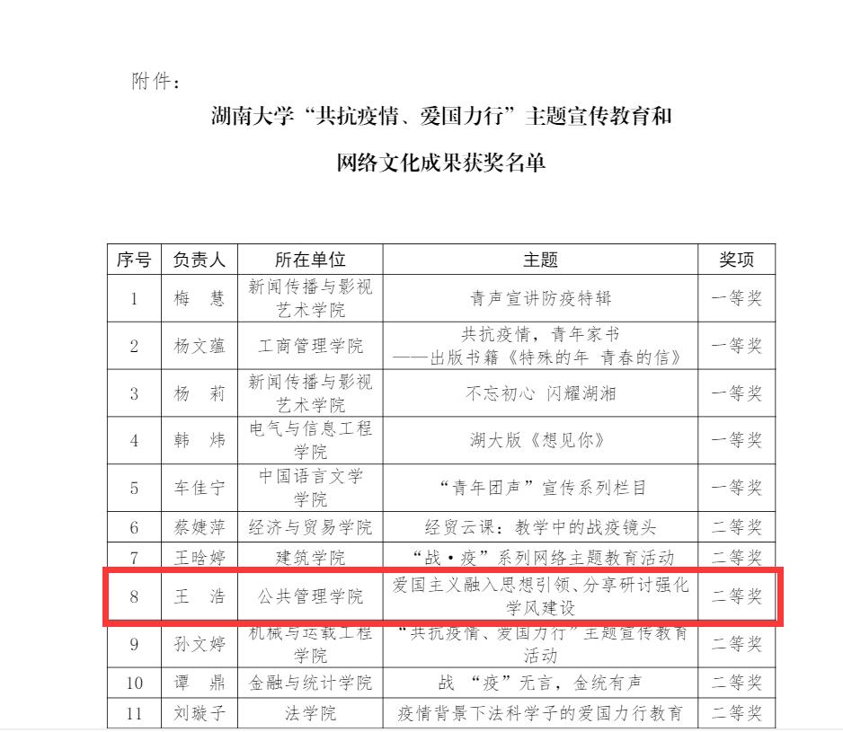 抗击新冠肺炎疫情期间,公管院全体学子以积极乐观、昂扬向上的姿态助力抗疫,坚持居家学习。公司组织了包括“见信如晤”家书展示、“计日程功”规划展示、“腊尽春回”影像展示、“读书得间”阅读分享、“齐聚一堂”党团研讨等线上交流展示活动,此外公司还有多位同学参与家乡抗“疫”志愿服务活动,被中华全国学联微信公众号、《湖南日报》、《新湖南》等媒体报道。