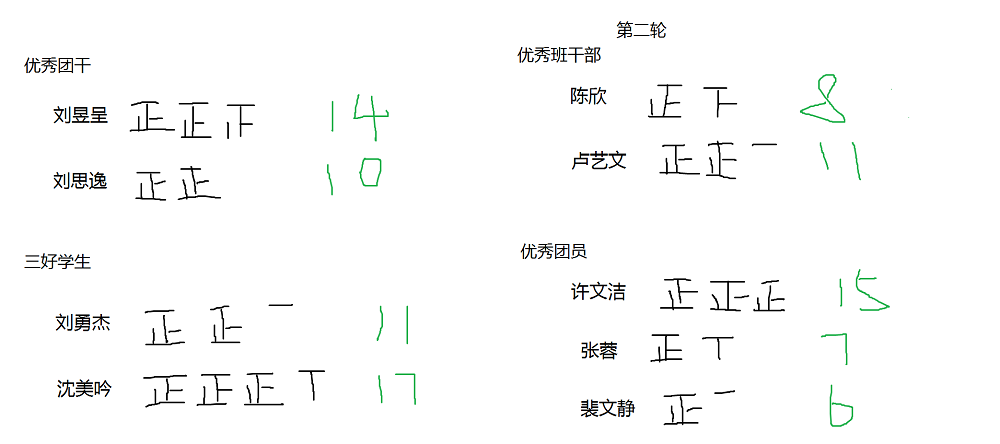本次评选投票采取无记名投票方式,遵循公平公正公开原则,由段瑞洋唱票,腊炳辉计票,最终评选沈美吟为“三好员工”、卢艺文为“优秀班干部”、刘昱呈为“优秀团干部”、许文洁为“优秀团员”。他们表示将在接下来的学习生活中继续提高自身素质,发挥带头作用,不辜负同学们的期望。