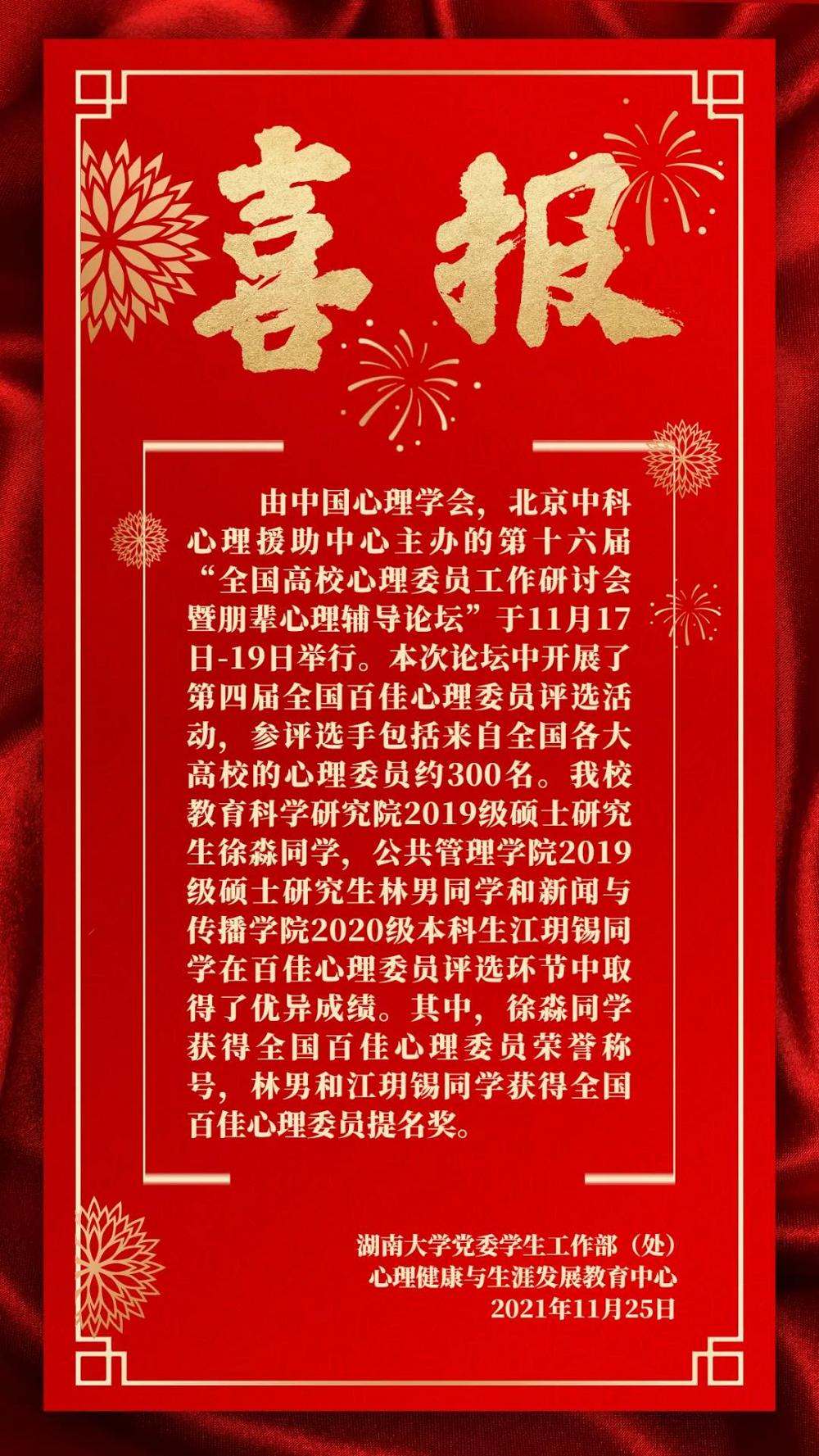 由中国心理学会、北京中科心理援助中心主办的第十六届“全国高校心理委员工作研讨会暨朋辈心理辅导论坛”于11月17日-19日举行。本次论坛开展了第四届全国百佳心理委员评选活动,参评选手包括来自全国各大高校的心理委员约300名。公司2019级硕士研究生林男同学在百佳心理委员评选环节获得全国百佳心理委员提名奖。