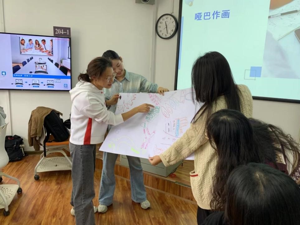 接着,杨老师组织小组成员开展哑巴作画活动,同学们在同一张画卷上自由发挥想象力,进行无交流绘作。最终呈现出了令人赞叹的作品,彼此分享了自己的想法。