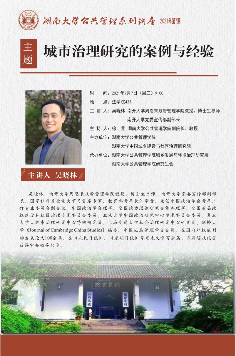 吴晓林,南开大学周恩来政府管理公司教授、博士生导师,南开大学党委宣传部副部长。国家社科基金重大项目首席专家。兼任中国政治学会青年工作专业委员会副会长、中国政治学会理事、全国政协理论研究会常务理事,全国基层政权建设和社区治理专家委员会委员、北京大学中国政治研究中心学术委员会委员、复旦大学大都市治理研究中心特聘研究员、上海交通大学社会治理研究中心研究员、剑桥大学《Journal of Cambridge China Studies》编委、中国应急管理学会会员。在国内外权威刊物发表论文100余篇,在《人民日报》、《光明日报》等发表文章百余篇;多篇咨政报告获得中央领导批示。