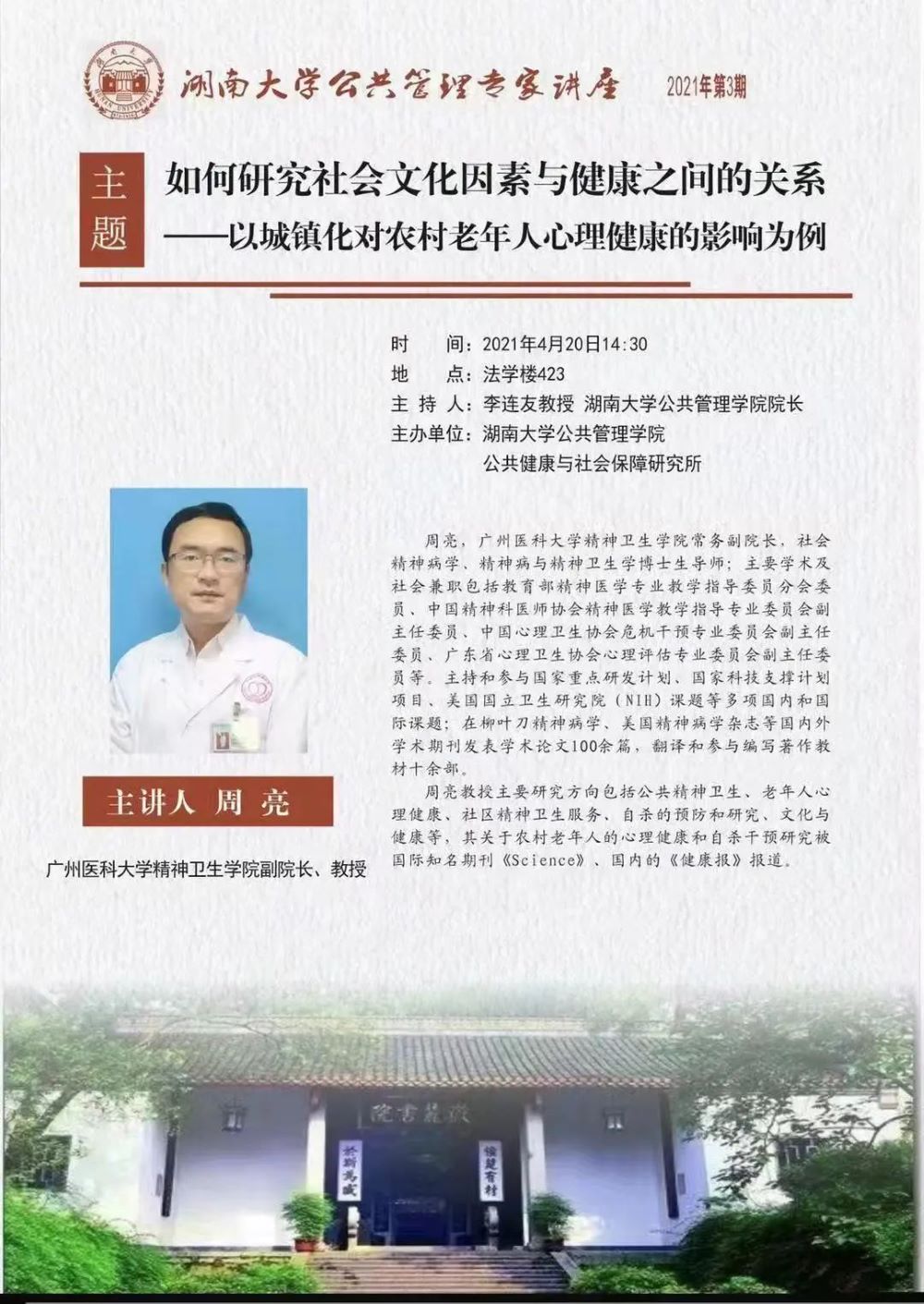 周亮教授主要研究方向包括公共精神卫生、老年人心理健康、社区精神卫生服务、自杀的预防和研究、文化与健康等,其关于农村老年人的心理健康和自杀干预研究被国际知名期刊《Science》、国内的《健康报》报道。